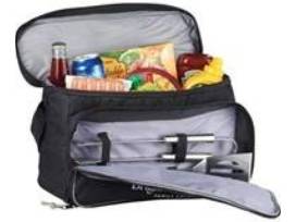 smaller cooler bag, 2 collapsible chairs with drink holders, 2 collapsible dog bowls, outdoor Bluetooth speaker