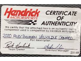 A piece of the 2020 Hendrick Motorsports #88 Alex Bowman Valvoline Camaro. Piece measures approximately 10" X 33" at the longest part. COA Included.
