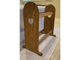 Beautiful handmade wood throw/quilt rack. Carved heart design. Dimensions: 32" long, 32" high, 16 in. deep.