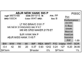 FP032 leads off the Charolais section of the sale and she is a great one. Moderate, soft made, and free moving. Big -3 BW, to 65 YW spread and a $Profit over $14000! Mating with New Hank will be sure to produce a calf with breed leading epds. Est epds…-1.7 BW, 73 YW, .65 REA, and .23 IMF.