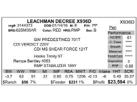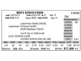 FS696 leads off our bred cow portion of the sale. She's a registered SimAngus with a 161 API and a 86 TI, as well as a $17500 $Profit! Mating with Decree will produce a calf nearly $21000 $P and 171 API, which is rare territory for a red!