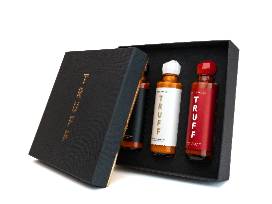 TRUFF Variety Pack of gourmet sauces. Sophistication inside and out. The Original, HOTTER, and White TRUFF Hot Sauce assorted elegantly into a matte black and gold foil gift box.