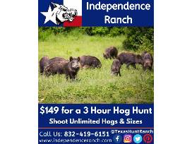 This is a 2 Man-3 day, 2 night wild hog hunt package, valued at $1600!