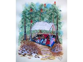 The original artwork was done by artist and WSA parent, Kimberly Fulton, for the the Second Grade class auction project, and features repurposed masks donated by each Grade 2 student. They are collaged together to create the landscape and tent-scape inspired by Waldorf in the Woods. The result is a colorful rich multi-media mosaic original.