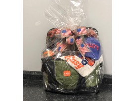 Basket inculdes: soft side cooler, 2 bag lawn chairs, Barrell Toss game, bumper sticker, beef jerky, tumbler, ball cap, banana chips and chocolate pretzels