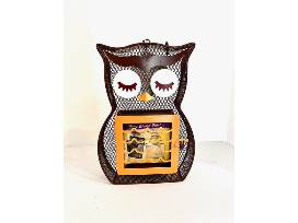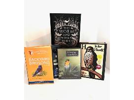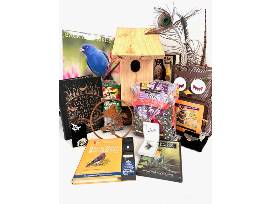 Basket includes: Bluebird house, 2023 bird calendar, thistle seed sock, songbird seed, decorative metal bird hanging, 4 bird pins, penguin pendant necklace, warbler bird video, owl shaped suet feeder with suet, audio bird field guide, and 2 books: H is for Hawk and The Worm and The Bird.