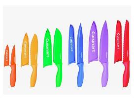 These six knives with matching blade guards and ergonomic handles are made of high-quality stainless steel with a non-stick coating for easy slicing. Set includes an 8" Chef Knife, 8" Slicing Knife, 8" Serrated Bread Knife, 7" Santoku Knife, 6.5" Utility Knife, and 3.5" Paring Knife.
