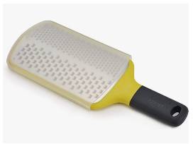 This compact grater features two styles of grating blades in one design, saving valuable drawer space. The coarse blade is ideal for grating firm cheeses and vegetables. The fine blade is perfect for hard cheeses, like parmesan and citrus fruits. The paddle design makes it easy to grate directly over plates and the non-slip tip provides extra grip while grating.