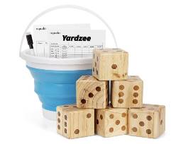 ROPODA giant wooden yarn dice for outdoor fun, BBQ, party, or event. Includes 6 dice, collapsible bucket, score card, and dry erase marker.