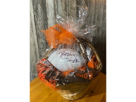 Be the envy of your friends with this autographed Browns Football by Wyatt Teller "ranked the #1 Guard in NFL Football in 2020" along with a rare bonus -- a Wyatt Teller Autographed Playoff T-shirt! If you're a Browns Fan this is a must have and will continue to increase in value! Basket also includes a full-sized Browns season ticket holder's flag and scarf.