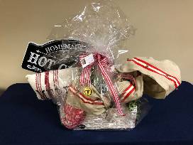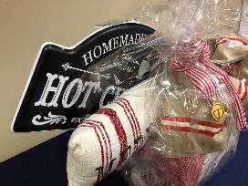 This adorable basket includes lots of fun stuff to decorate with for the holidays including a 'Hot Chocolate' sign, a 'Merry Christmas' pillow, and much more!