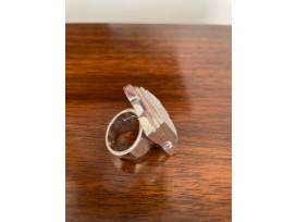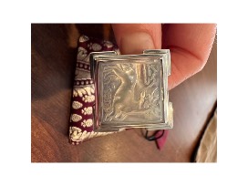 Take yourself back to a time of classical adornment. This signed Barry Brinker 980 pure sterling silver ring is a stunner. You'll find Barry's one-of-a-kind designs at Neiman's and Saks 5th Avenue. The face of the ring is hand-carved mother of pearl, carved in Bali in the shape of a deer. The carving was inspired by a convent in Lisboa. It is a large, square statement ring intended for the middle finger; size 8-8.5
