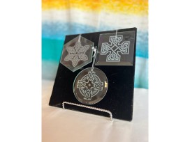 Sandblasted glass ornaments for hanging on Christmas trees or in sunny windows year-round. The beveled edges act as prisms, throwing rainbows around the room.