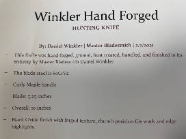 This one of a kind, custom made blade, was hand made by Master Bladesmith, Daniel Winkler. Signed certificate of authenticity is included.