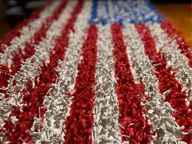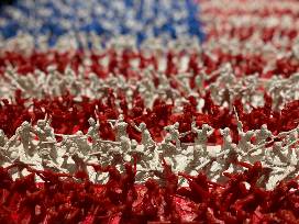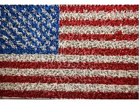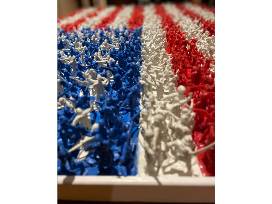A handmade Little Army Man Old Glory Flag. This Flag's size is the Regiment level, measuring 3' wide X 2' tall, with approximately 1500 Army men, each glued individually by hand.