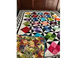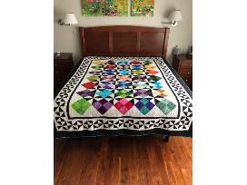 This 75" by 95" full size quilt is from a pattern design by Judy Laquidara. When designing this quilt, a variety of vibrant multicolor batiks were used in the four patch block and placed on point. The black and white pinwheel designs were used as contrast and also placed on point. To further enhance the design, a border of pinwheel blocks was used.