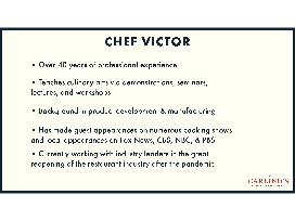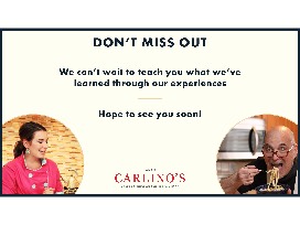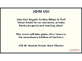 This is sure to be an exceptionally fun and educational event! With over 40 years of experience, Chef Victor and Chef Angela teach culinary arts via seminars and workshops, appear on CBS, NBC, and FOX News cooking shows, and work with industry leaders on restaurant reopening. You and 7 other guests will learn to cook in the well-known and family run Carlino's kitchen in West Chester. Angela and Victor can't wait to show you what they've learned through their experiences! Experience to be scheduled on a mutually agreed upon weeknight.