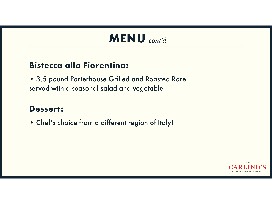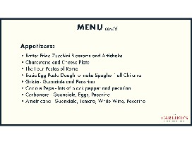 Menu Includes: Batter Fried Zucchini Blossoms and Artichoke, Charcuterie and Cheese Plate, The Four Pastas of Rome, Basic Egg Pasta Dough - Spaghetti all Chitarra, Gricia - Guanciale and Pecorino, Cacio e Pepe, Carbonara, Americana, 3.5lbs Porter House steak with salad and vegetables, Chef's Choice of Dessert.