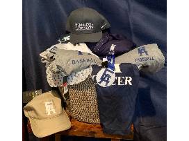2 baseball hats (EA & lacrosse), mens golf shirt (golf), sweatpants, shorts, long sleeve large Nike football shirt, soccer shirt, 3 tshirts (baseball, football, ea), 1 running shirt, a magnet, and two fab/name holders.