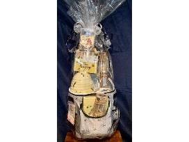 Also, included: a Honey Gift Basket: Beautiful honey bee rolling picnic cooler filled with honey, plates, napkins, honey bee ceramic mini serving dishes, silverware, honey spoons and a ceramic cookie jar.
