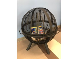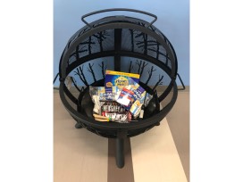 Wood burning fire pit (33.85in x 32.67 in. x 35 in.) is filled with a $75 gift card to Academy Sports and Outdoors, family sized box of Graham Crackers, Hershey's chocolate bars, large marshmallows, and telescoping roasting sticks for the whole family.