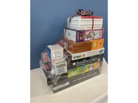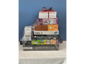 Included: Pocket Flyers Paper Airplane book, Awesome Kitchen Science Experiments for Kids book, Moon Lamp, Straw Constructor STEM Building toys (300 pieces), Tech Will Save Us Synth Kit, Mastermind game, Engino Discovering STEM Mechanics Levers & Linkages, Smithsonian Solar Powered Eco-Wheels Advanced kit, Dominos, Set the Family Game of Visual Perception, Color your own trinket boxes (3), Ooze Labs Chemistry Station, Buildzi, 51 Piece Oil Paint & Easel kit, 5 pack of Canvases, and a Kiwi Co. Tinker Box