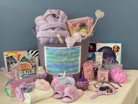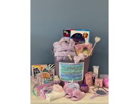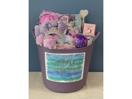 Everything a princess needs is in this basket. Your little princess will be decked out with her crystal princess tiara, crystal & rhinestone scepter, purple fleece robe (size 7/8), purple fuzzy slippers (size 13), unicorn plush eye mask, nail polish kit, crystal nail file, Merry Go Play surprise bath bombs (6), Unicorn Surprise bath bomb, Honest Co. Lavender bubble bath and body lotion, purple fuzzy spa headband, purple hair towel wrap, white hair towel wrap, grape cotton candy, grape rock candy lollipops (10), mermaid hair brush, purple butterfly hand mirror, purple loofah, Squishamel Surprise, My Look glitter make up compact by Cra-Z-Art, and glitter headbands (3).