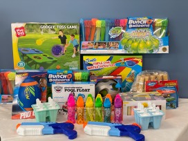 Put on the SPF and get ready for fun. Make the best of the Texas heat with this basket full of Buncho Balloons (420 pack), a Nerf football, watermelon pool float, Googly Toss game, wooden outdoor bowling set, silicone popsicle molds, diving toys, two water guns (medium sized), 12 pack of bubbles, sidewalk chalk, and a Slip & Slide.