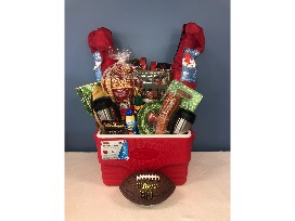 Heat up the grill and turn on the football game. This basket will get you set up for the big game. Basket includes Wilson NFL football, Farberware touchdown cutting board (8''x10''), rubber coated bottle opener, football game day party supply pack (18 cups, 18 plates, 36 napkins, and 2 tablecloths), 4 pack of 12 oz. slim can koozies, bamboo football-shaped cutting and serving board (14''x18''x1/2''), 2 folding camp chairs, 36 quart Coleman hard sided cooler, corn hole set (2'x3'), tailgating snacks (nuts, beef jerky, trail mix, popcorn), bug spray, sunscreen, large football tumbler with lid and stainless straws, BBQ spice set, blanket, and 24 oz stainless insulated travel mug (set of 2).