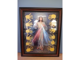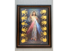 26''x32'' Framed Divine Mercy print with the handprints of Mrs. Weldon's students. "Jesus, I Trust in You" printed across the bottom.