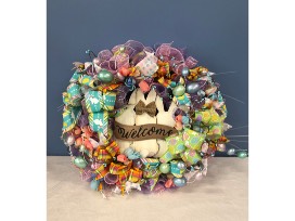 24'' Wide beautiful Spring wreath with pastel colors and egg accents. Inside the wreath is a cut out of three rabbits with "Welcome" written in it.