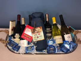 2 Bottles of Pinot Noir, 2 bottles of Cabernet, 2 bottles of Chardonnay, $50 Papas gift card, $50 Landry's gift card, single wine bottle tote, and assorted Ghirardelli chocolates.