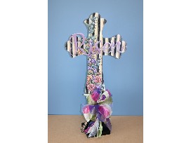 Celebrate Easter with this durable, attractive yard decoration. 33'' Tall Round Top Easter cross with "Risen" written across it. Cross stands on a pedestal with beautifully coordinated bow.