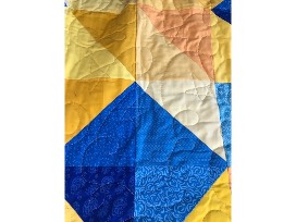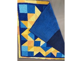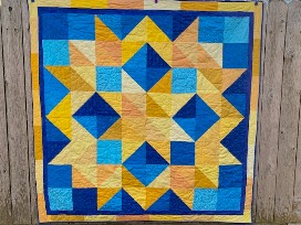 64''x64'' Hand quilted "Carpenter's Star" quilt made by Mrs. Brinker. The quilt is made out of the blues and golds of Epiphany school colors and has the star incorporated into the quilting pattern. The back of the quilt is a very soft "minky" fabric.