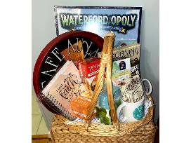 Basket of coffee and tea items, included is Waterford Monopoly Game!