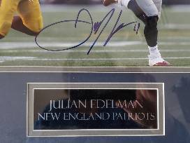 Signed Framed Photo of Patriots Wide Receiver Julian Edelman. Certificate of Authenticity on back. (taking picture of this item caused a reflection in the glass)