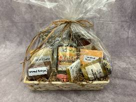 Basket includes a bottle of peach moonshine, two blocks of smoked cheese, a long of smoked bologna and several condiments all courtesy of Blackbird DIstillery