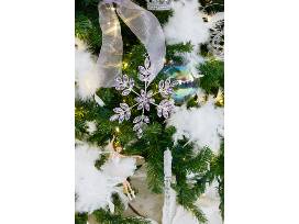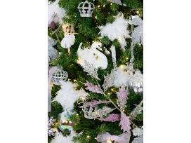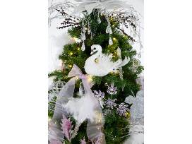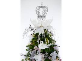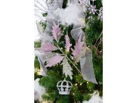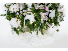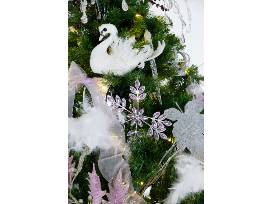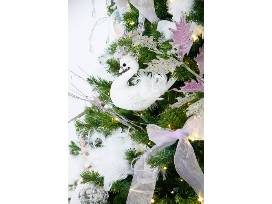 This tree was inspired by the famous Petipa/Tchaikovsky ballet, Swan Lake, a favorite of Segerstrom Center ballet fans. We chose white and silver ornaments to represent the serene lake and the beautiful swans. Crowns figure prominently, shadowing the story of the princess who was turned into the beautiful Swan Queen, Odette. The accent color of lavender represents our group, Pas de Deux.