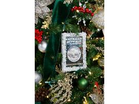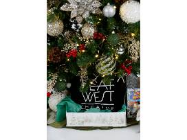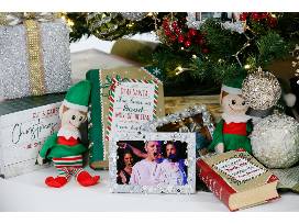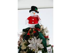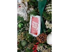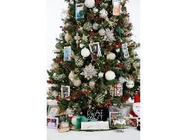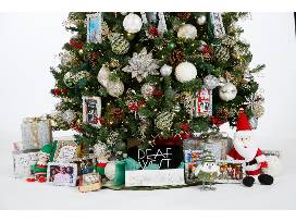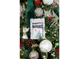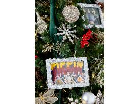 This tree celebrates 30 years of community, craft, and innovation. Framed photographic ornaments highlight 30 years of Deaf West productions, and can be replaced with family photos when this tree is taken home if desired! Pearls and dragonflies are symbolic of hope, change, and love. Under the tree are decorated gift boxes, a Deaf West T-shirt, stuffed figures of Santa, snowmen, birds, and elves.