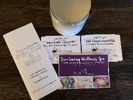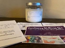 This package includes 3 gift certificates to Sanctuary Wellness Spa and a candle from Tidal Candle Company.