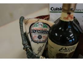 Spaghetti is on the menu tonight! This basket includes spaghetti noodles, a jar of marinara, Italian breadsticks, Italian desserts, a block of parmesan with a Cuisinart cheese grater, olive oil, two dishtowels, and a wood Print of Fruit and Wine by Rebecca Wickenheiser Heath