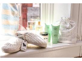 Package includes a cozy robe by Softies, luxurious pair of slippers by P.J. Salvage, a pillow case from Face Plant, a bottle of Shower & Shampoo, hand cream and foot cream by Erbario Toscano, and an Apple Cider soy wax candle by Arrow It Forward.