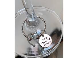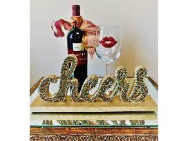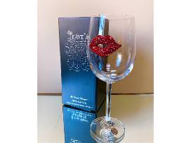 Indulge like a queen with this bejeweled gift set. This dazzling set features a ruby red-lipped wine glass, a gold, sapphire and pearl Cheers sign, and a bottle of deep garnet red wine. Wine glass includes a silver charm declaring this package for royalty.