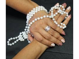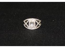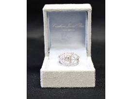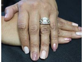 One 18K white gold and diamond ring. The ring features a prong set, patented "L'Amour" cut diamond weighing 0.50 carats. The diamond is surrounded by prong set, round diamonds that continue halfway down the split, open shank. The accent stones are full cut, round, brilliant diamonds, 102 diamonds have a combined weight of 0.78 carats. The ring is finger size 6.75. Value: $5,275.