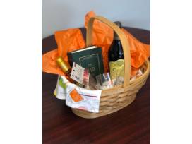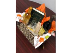 Wine, wine, wine! What's not to like? This basket includes a 2018 Caymus Cabaret, a 2017 Lions Sauternes Dessert wine, four tasting glasses, and a William Sonoma Bar Book.