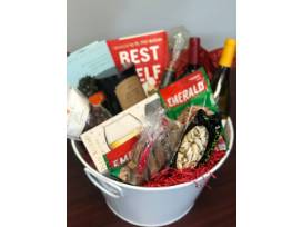 Sometimes after a long day of work, a glass of wine and perfectly paired snack foods are what you really need. This After Hours Wine Basket has you covered with four wine glasses, Chardonnay, Cabernet Sauvignon, a candle, cheese board, and lamp, two books, an assortment of nuts.