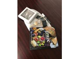 Get the bones for your next charcuterie board with this set. It includes a cookbook, a set of three Crate and Barrel cheese knives, a stone charcuterie board, and chalkboard appetizer labels.