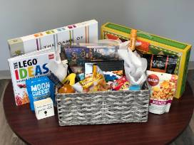 Game night in a basket! This one has everything from snacks and drinks (plenty of wine!) to puzzles and board games. Jump on this one for a fun night in.