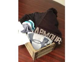 Set yourself or your favorite lady up with new Under Armor. This basket includes a cold gear jacket, t-shirt, cold gear cap, and no-show training socks (6 pairs), all size medium.