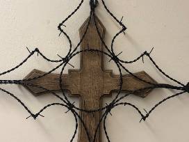 Large metal cross mounted on wood; makes for a great decorative additional to your home.